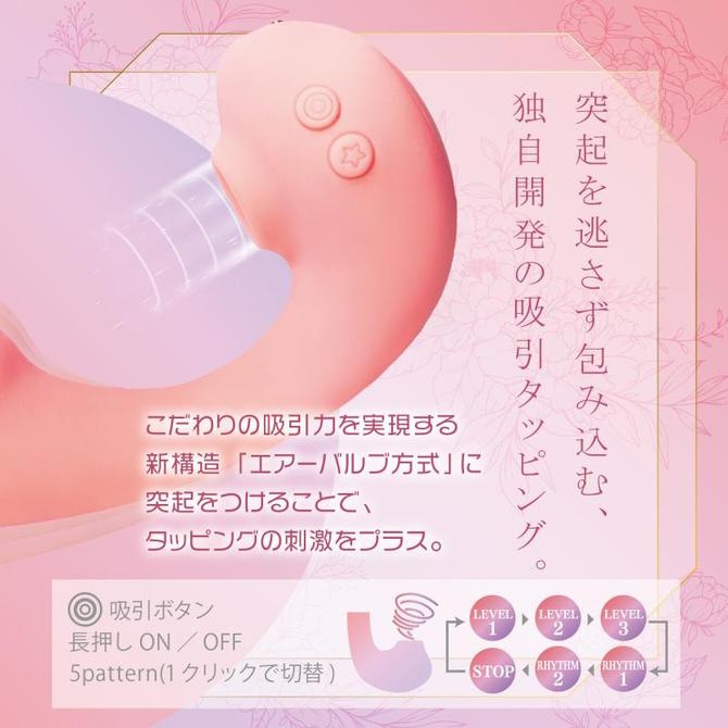 今回のモデルの最大の特徴は、自社開発した「エアーバルブ方式」の吸引機能です。クリをターゲットにした極小の穴径の中には小さな突起が付いており、吸引による刺激に加えてタッピングのような物理的な動きも同時に楽しめます。吸引は3段階の強弱と2つのリズムパターンから選べるので、その日の気分や感度に合わせて調整しやすいです。