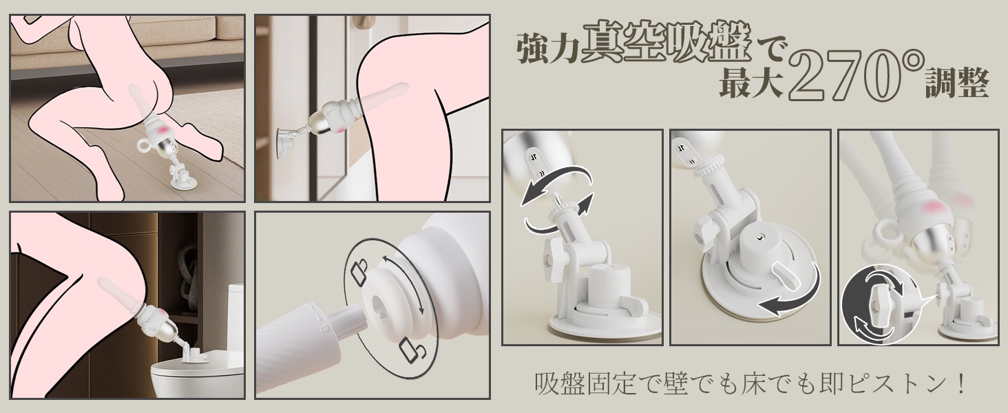 一方、付属の吸盤アタッチメントを使えば、床や壁にしっかり固定できます。角度は270度まで調整可能なので、自分にとってベストなポジションを見つけられます。ファッキングマシンのように自動でピストンしてくれるので、完全にリラックスして快感に集中できるのです。